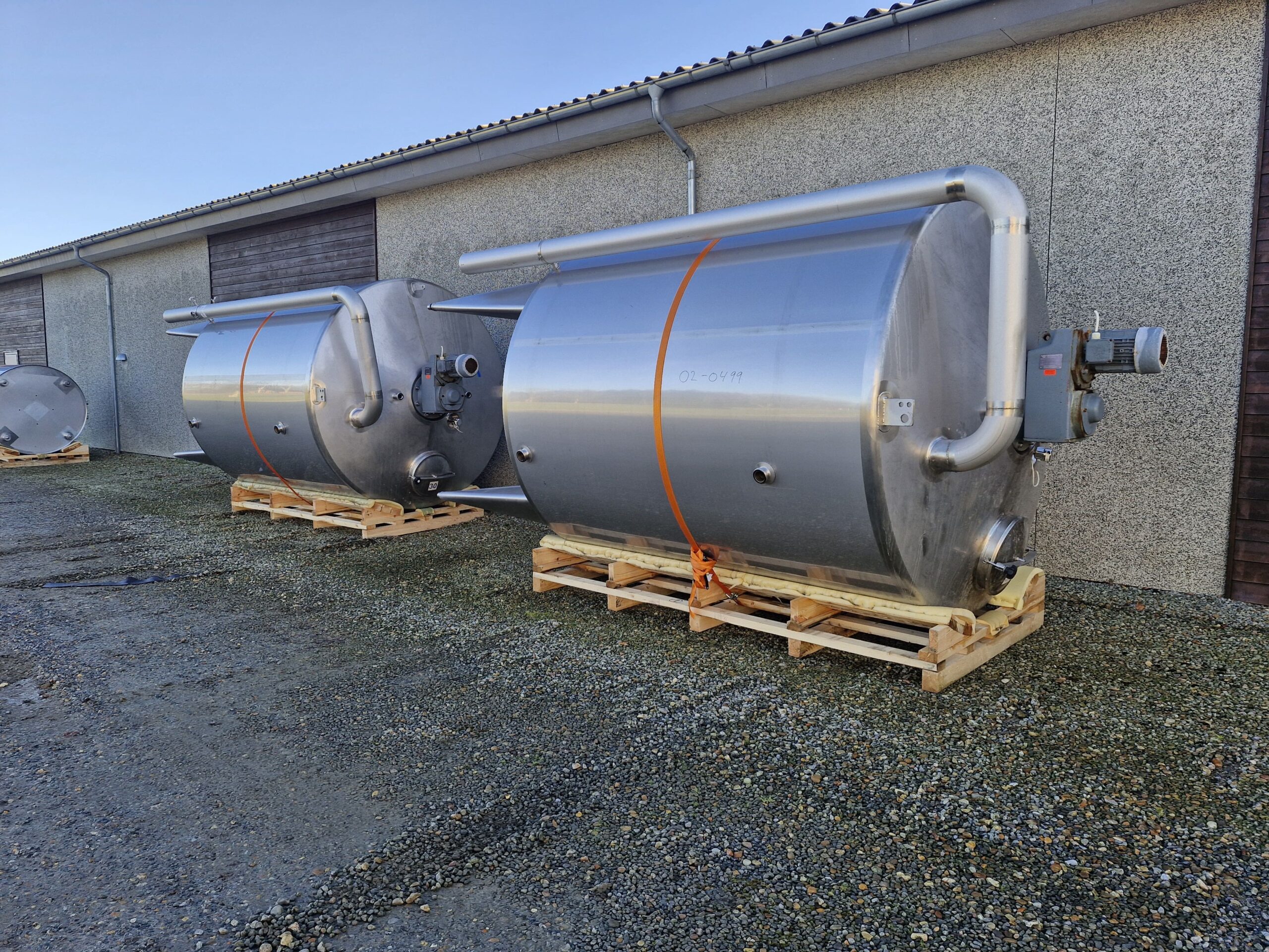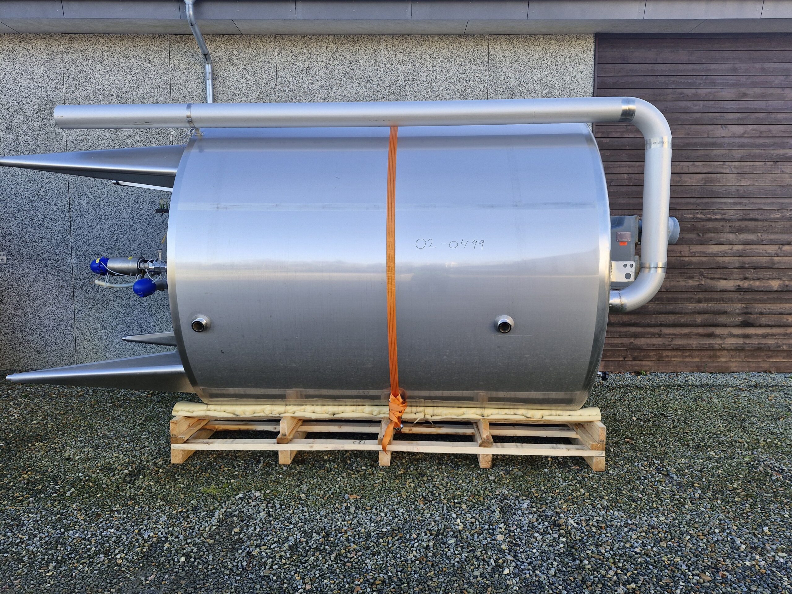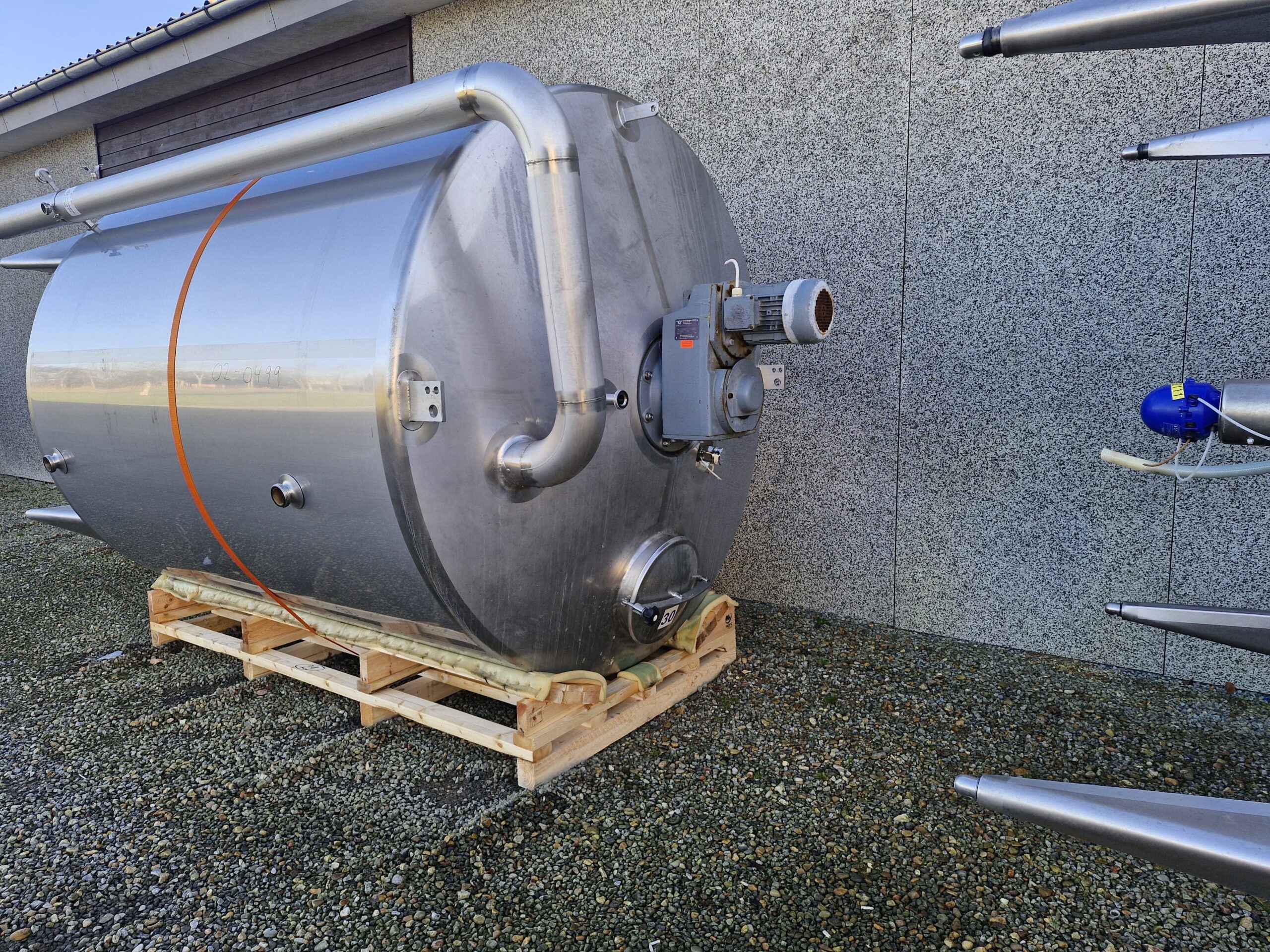 10.000 liter procestank 02-0499 Volumen: 10000 Lager: 2 Beskrivelse Stående procestank Køle/varmekappe Konisk bund 4 ben Udløb: 4″ Rammerørværk Mandehul Isoleret Justerbare tæer Udluftning CIP-rengøring Dimensioner: ø2400/2250mm – sh 2600mm – th 4350mm Skriv til os Kontakt os Anders Lundum Salgschef, brugt udstyr +45 4093 3957 alu@fhscandinox.com